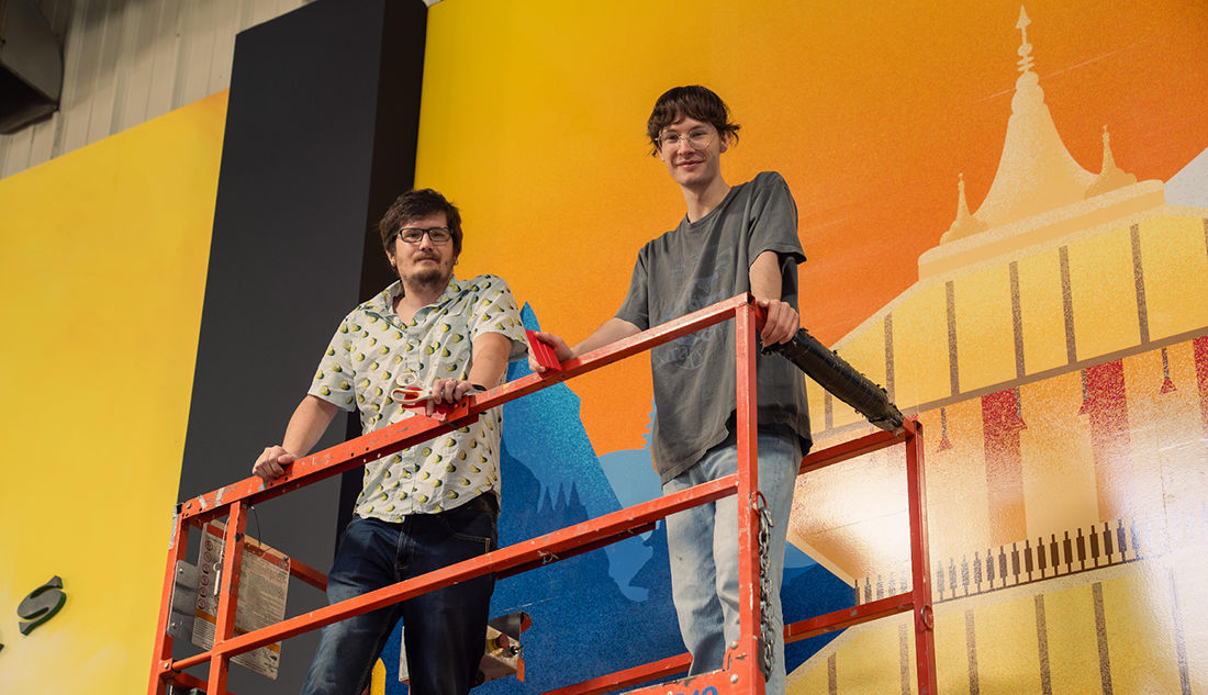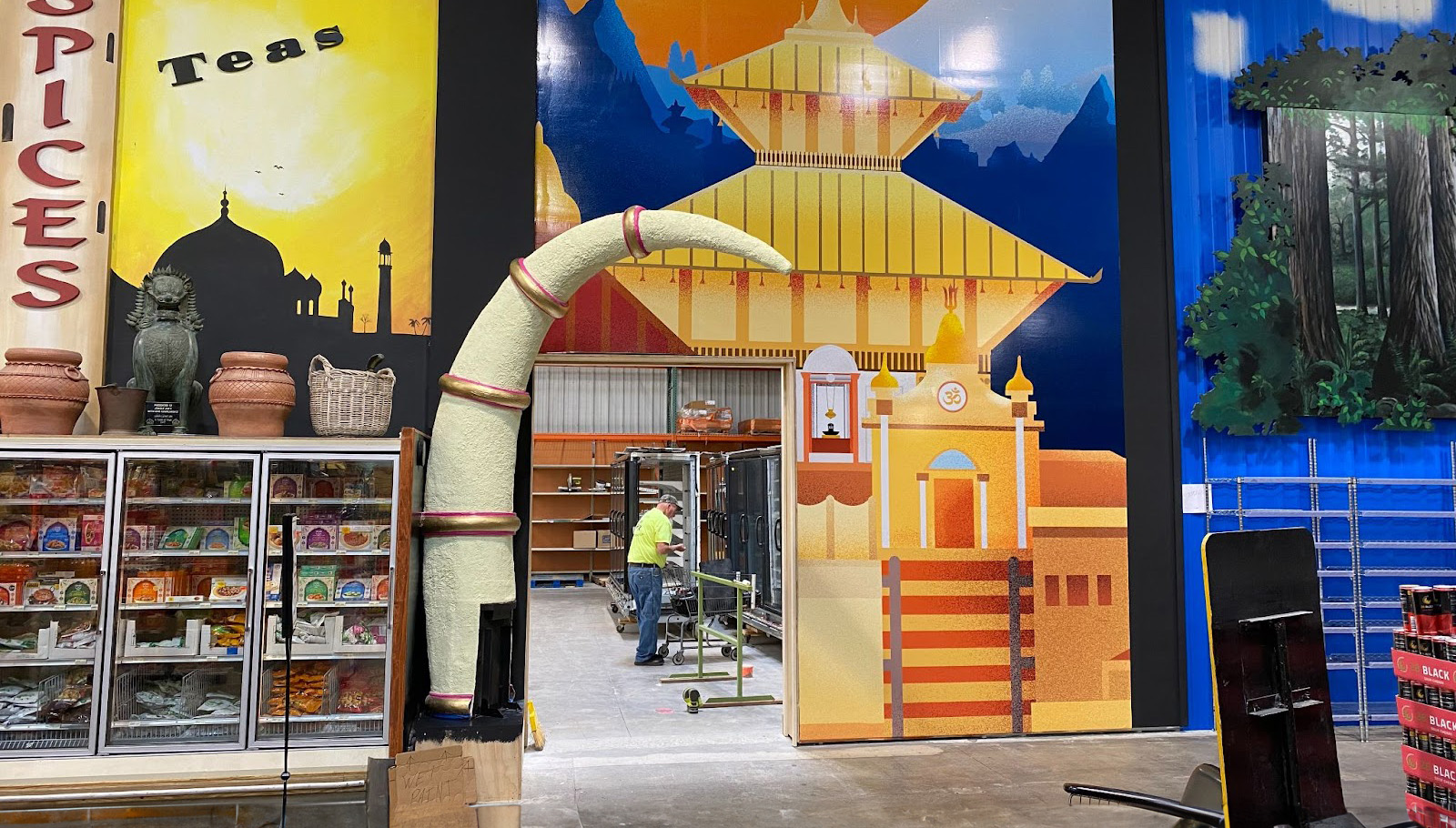 The largest thing I ever installed at Jungle Jim’s was the entryway to a new 2000 sq ft addition to the store. The mural depicts the Pashupatinath Temple in Kathmandu with simple linework, vibrant colors, and dense texturing. While we didn’t have the space to make it life sized, the mural still stands at about 30 feet tall.